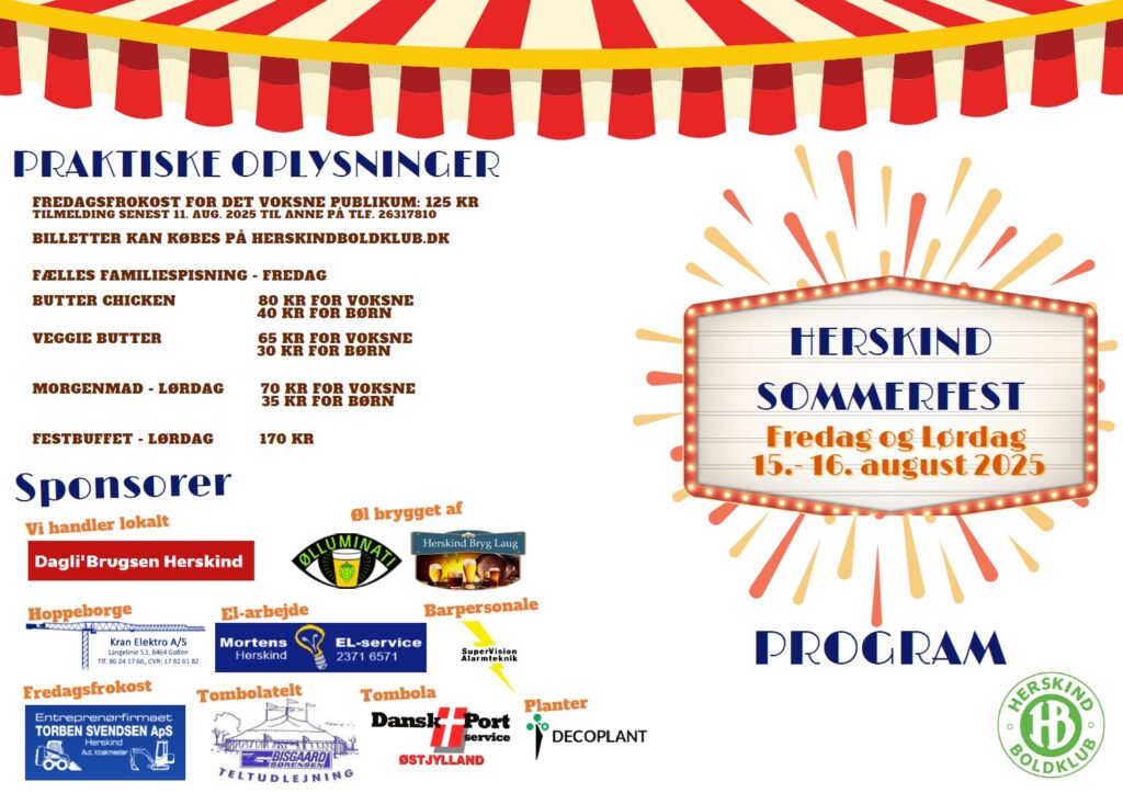 Herskind Sommerfest 2025 finder sted fra fredag d. 15. til lørdag d. 16. august i sommerfestteltet på boldbanerne ved Herskindhallen. Her på siden kan du se programmet for weekenden og du kan købe billetter til: